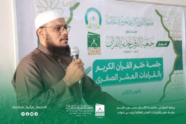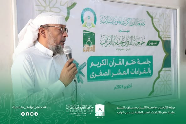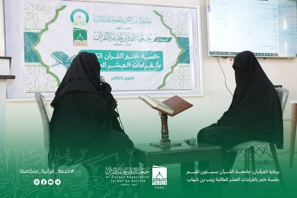 برعاية الفرقان، جامعة القرآن بسيئون تقيم جلسة ختم بالقراءات العشر للطالبة زينب بن شهاب - 02-10-2025