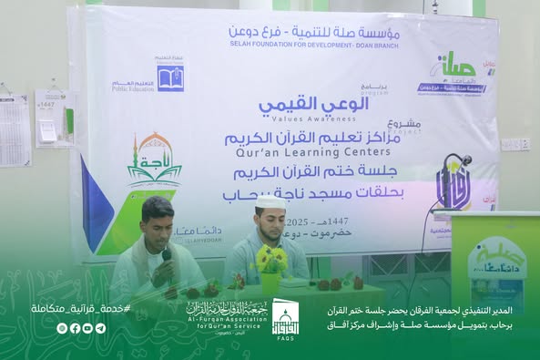حضر المدير التنفيذي لجمعية الفرقان لخدمة القرآن - حضرموت جلسة ختم القرآن الكريم للطالب أحمد محمد علي بامطرف، بجامع ناجه في منطقة رحاب بدوعن بتمويل من مؤسسة صلة للتنمية – فرع دوعن، وإشراف مركز آفاق للتنمية المجتمعية. وفي الجلسة ألقى مدير مؤسسة صلة فرع دوعن الأستاذ أحمد يسلم بلفخر كلمة هنأ فيها الطالب ووالديه وأسرة آل بامطرف وأبناء المنطقة، ناقلاً تحايا المدير التنفيذي للمؤسسة الأستاذ علي حسن باشماخ، ومستعرضا جملة من المشاريع النوعية التي تنفذها المؤسسة. كما ألقى مدير مركز آفاق للتنمية المجتمعية الأستاذ محفوظ بارمضان كلمةً أشار فيها إلى فضل القرآن الكريم ودور الوالدين في غرس قيمه في الأبناء، حاثّاً أولياء الأمور على الحرص في إلحاق أبنائهم بالحلقات القرآنية. بدوره ألقى الدكتور باجهام كلمة عبر فيها عن سعادته بهذا الإنجاز القرآني، مشيداً بدور المؤسسات الداعمة للعمل القرآني، ومؤكداً على الشراكة والتكامل القائم بين جمعية الفرقان ومؤسسة صلة – فرع دوعن في خدمة كتاب الله. واستمع الحضور إلى ختم الطالب أحمد بامطرف من أواخر سورة البقرة على يد معلمه الأستاذ أنور المقطري وسط أجواء إيمانية، ليختتم الحفل بتكريم الطالب ووالده بحضور عدد من الشخصيات الاجتماعية وأبناء المنطقة